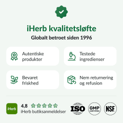 Selvom iHerb bestræber sig på at sikre nøjagtigheden af sine produktbilleder og -oplysninger, kan visse produktionsændringer af emballage og/eller ingredienser afvente opdatering på vores hjemmeside. Selvom varer lejlighedsvis muligvis sendes med alternativ emballage, er friskhed altid garanteret. Vi anbefaler, at du læser etiketter, advarsler og brugsanvisninger for alle produkter inden brug og ikke udelukkende stoler på oplysningerne fra iHerb. Denne hjemmeside er blevet maskinoversat som en service til vores kunder. iHerb garanterer ikke, at oversættelserne er fuldstændige eller fejlfri, og iHerb er ikke ansvarlig for eventuelle oversættelsesfejl eller udeladelser.
